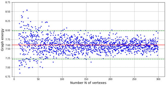 To complete the validation of the obtained results we have to answer the question whether the obtained energy values are statistically significant. One hundred samples of distributions with a strictly limited number of disks were examined in each class. From the carried out experiments it is not clear whether such several samples and disks in a cell gives representative results. For this reason, an additional experiment was carried out to estimate the dynamics of graph energy fluctuations depending on the number of disks placed within the cell. Calculations were made for the number of disks N from 10 to 300. To reduce the impact of the random nature of RSA on the accuracy of the results, five measurements were made for each N. The horizontal red line in Figure 11 shows the mean value for all scores, while the dashed green lines show the deviation from the mean.