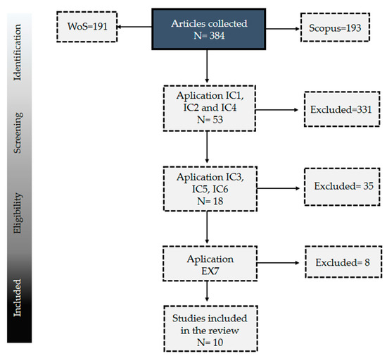 First, using the Prism Declaration [46,49] as a reference, the procedure was divided into four specific phases. The first, called “Identification”, consisted of applying the database search equation, filtering the search for scientific articles (IC1, EX1) in English or Spanish (IC3, EX3), obtaining a total of 10 documents (WoS; Scopus). After that, in the review phase, most of the inclusion criteria (IC2, IC4, IC5) and exclusion criteria (EX2, EX4, EX5) were applied. Finally, duplicate articles were eliminated (EX7) in order to finally obtain a sample of articles to be analysed (n = 10).