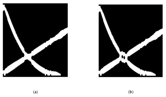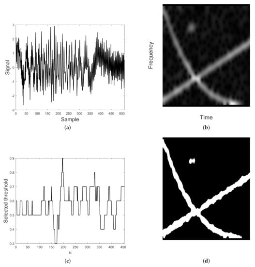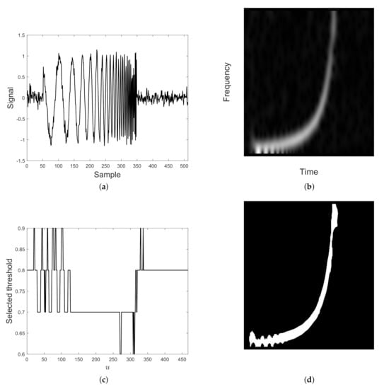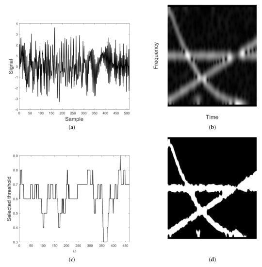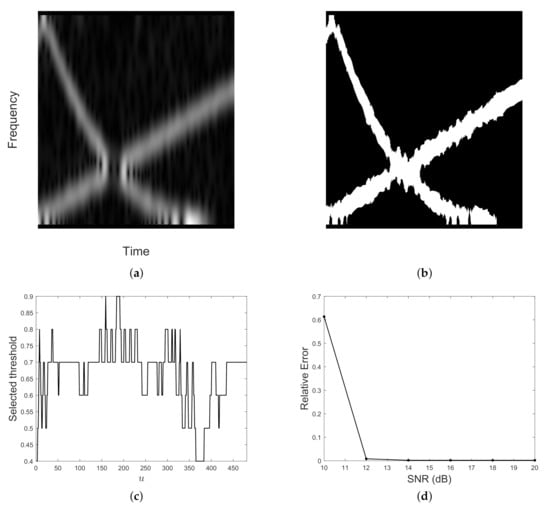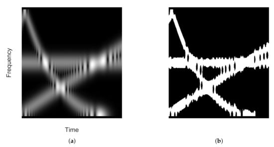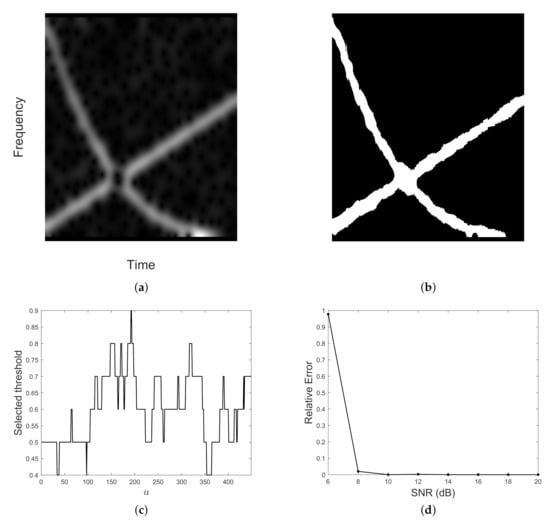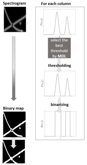 For a fixed , the threshold value defined by Equation (18) is selected as the best spectrogram column model. Spectrogram column is then converted to a binary sequence according to Equation (15), with . By repeating the procedure for each , a binary map is finally obtained.