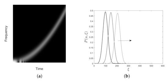 Limited to the support of , spectrogram satisfies the evolution law in Equation (5). As a result, for each fixed u, we observe two window profiles which move independently in the TF plane, according to the corresponding IF, but with invariant support lengths.