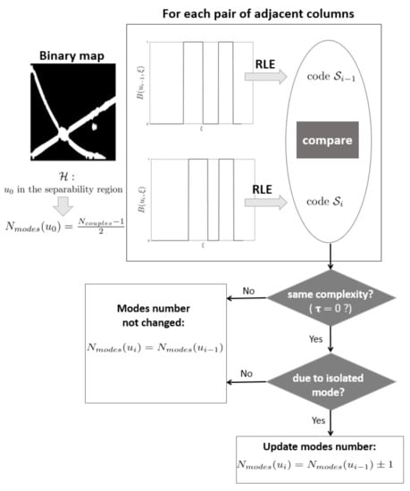 In our assumptions, the separability region corresponds to most of the spectrogram domain. According to Section 2.2.5, this is equivalent to say that most of spectrogram columns belong to the typical set (i.e., modes are separated at time u), while few columns do not (i.e., modes do interfere at time u). A sequence of typical columns can be interpreted as a stationary process (entropy does not significantly change). Conversely, switching from a typical to a non-typical column can be seen as non-stationarity (entropy significantly changes). Therefore, spectrogram can be globally interpreted as a non-stationary process where separability regions may be alternated to interference ones. This argument allows us to correctly estimate the number of modes, even in case of interference.