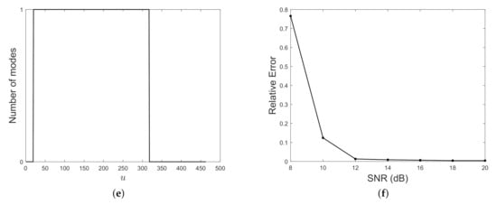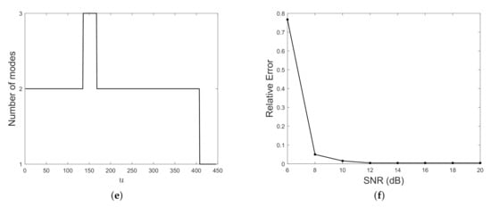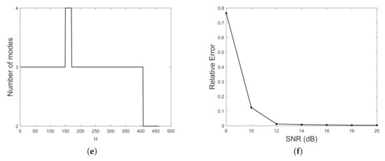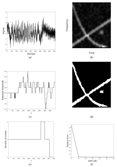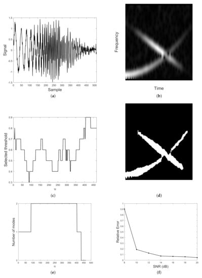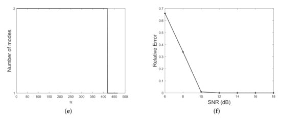 In Figure 15 a two-component AM–FM signal is considered. Specifically, it is the superposition of a quadratic mode modulated by a linear amplitude and a linear chirp modulated by a gaussian amplitude, embedded in AWG at SNR = 15 dB. The signal in the time domain is shown in (a) and its spectrogram can be found in (b). As before, MDL functional minimization provides the optimal thresholds in (c) for obtaining the map depicted in (d). The detected number of components is shown in (e) and the relative counting error for varying SNR is plotted in (f). Also in this case, the proposed method estimates the correct number of modes at the interference region.