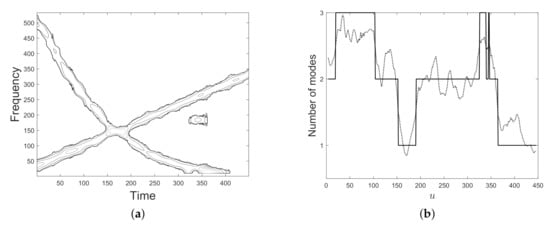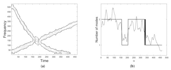 A method for estimating the number of modes of an FM signal has been proposed in [34,35]. This paper introduced a local version of Rényi entropy, namely Short-term Rényi entropy, as a measure of signal complexity, i.e., the number of components. As main advantage, the presented procedure does not require the prior knowledge of one signal mode complexity and it applies to MCS whose modes are differently FM, e.g., a polynomial and a sinusoidal IFs. This approach is very interesting but it suffers from some drawbacks. Specifically, it needs a synthetic reference (piece of) signal to estimate the Rényi entropy and then the components number. As major limitation, constant amplitude as well as non-overlapping components are also required to give a correct final result. In particular, the experimental results presented in [34,35] have confirmed method limitation in overlapped modes analysis. Precisely, in the cases shown in Figure 1, Rényi entropy-based method is expected to detect only one component at the interference regions. Some limitations in Rényi entropy-based approach have also been highlighted in [36].