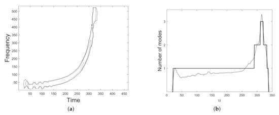 Figure 22 is aimed at showing method capability in dealing with complex signals and refers to the sum of a sinusoidally FM component and a linearly one. As confirmed by Figure 22f, the proposed method provides the correct number of modes, although the presence of cross-terms and intersection between modes.
