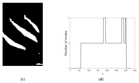 Figure 23 concerns a three-component signal where one mode (the constant chirp) presents a much higher energy with respect to the others, that conversely interfere with each other in a destructive way, as shown by spectrogram in (b). In this very pathological case, the threshold value obtained by MDL functional minimization does not provide a consistent representation—null contribution is observed in the binary map in (c) in a subregion of the second interference region. From Figure 23d, we can observe that only the dominant constant chirp is detected in that subregion.