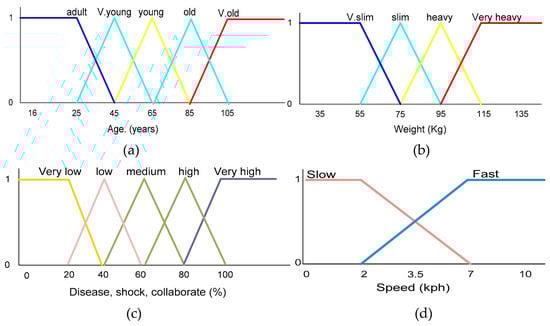 Inside this developed model, various properties for each individual were collected—for example, physical, emotional, and biological properties—and then these properties were manipulated via the idea of the fuzzy logic technique. This manipulation was used for the fuzziness of each property and then helped the developed model to reach a realistic solution. From the fuzziness of each property, the model signified a specific range of qualities spanning to create a linguistic variable—for instance, “disease {very low, low, medium, high, very high}, weight {very slim, slim, heavy, very heavy}, age {adult, very young, young, old, very old}, collaboration {very low, low, medium, high, very high} and shock {very low, low, medium, high, very high}” [12]. Then, for each range, a membership function was designed by the model. The membership functions of the age, weight, disease, shock, and collaboration are distinctly illustrated in Figure 1a–d [12]. Consequently, these membership functions were utilized in defining the individuals’ desired speed.