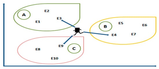Illustration of how the agent checks the distance of each exit Ei inside the classes A, B, and C based on the K-Nearest Neighbor (KNN) technique and then chooses the nearest one to evacuate from.