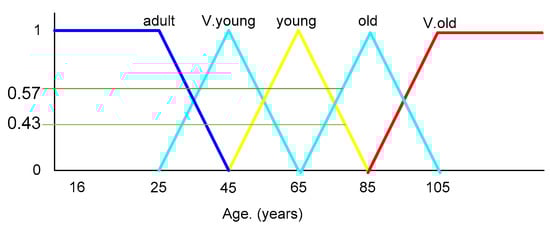 From Figure 3 it appears that an agent has an age, and the age ranges from 16 to 105; this range is partitioned into some class intervals. Each class interval is indicated with a specified name—for example, 16–25 is adult, 25–45 is very young, 45–65 is young, 65–85 is old, and 85–105 is very old. Based on the fuzzy logic idea, some equations are proposed by the author to find the weights of the properties’ values—for instance, if rgw age value equals 57 its weight is specified by Equation (2) [2] after specifying the lower value and upper value of the property via age membership functions. See Figure 3.