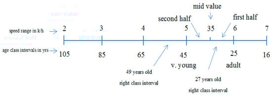 denotes the lower value, denotes the upper value, minisrd denotes the minimum interval speed range, and maxisrd denotes the maximum interval speed range of the mentioned properties. Because these weights participate in specifying the desired speed for an agent, the range of the speed must be identified. The speed range is assumed to be a minimum of 2 k/h to a maximum of 7 k/h, as shown in Figure 1. Each property has its range, as mentioned above, and for each property there is a value given randomly between its ranges or that could be chosen by the user of the simulation model. Moreover, this model created several class intervals for the speed range to keep a balance between the property value and the speed. For example, when an agent is 57 years old, this agent, according to designed age membership function 0.57 is young and 0.43 is very young, and its speed range is between 4 and 5 k/h. See Figure 4. The logical reason behind this separation in speed range was that older agents are slower than younger agents. Furthermore, Equation (5) () [12] was used to find the middle of the class interval chosen by the age membership function.