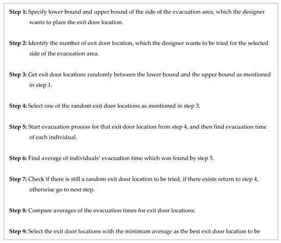 This proposed method was integrated with the created simulation model to increase the performance of the simulation model, and involved a new capacity of that model via simulating an evacuation area with various exit doors locations with the hope of identifying the best location for the exit door among them and also choosing the best design for the evacuation area. To confirm this method’s possibility, various experiments were performed in Section 4 and then discussed.