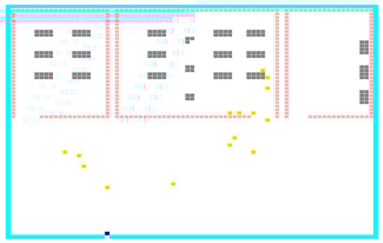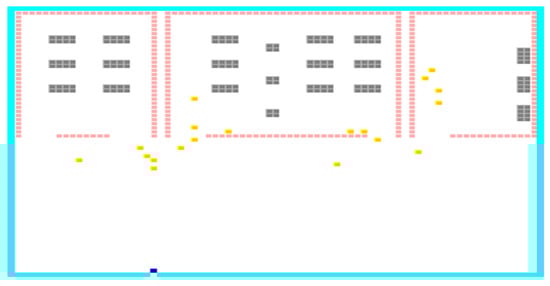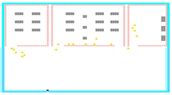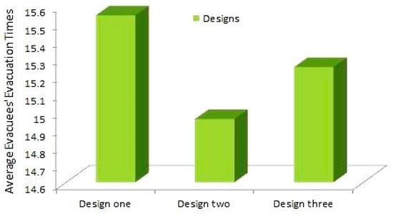 When change occurs in the evacuation area’s design, it changes the evacuees’ evacuation time within the evacuation process. Thus, it changes decision making to select the best exit door location for evacuation, among others. For instance, in Figure 6, Figure 7 and Figure 8, an evacuation area contains three different parts. As mentioned in the model developed in paper [12], the first part is the employees’ part, the second part is the student part, and the third part is the staff part. As shown in Figure 6, each part has one exit door. From the results shown in Table 4, the best exit door location was (70,47), with an average duration of 15 s and 541 milliseconds. Moreover, as shown in Figure 7, the students’ part has two exit doors, while the employees’ part and the staff’s part have one exit door. From the results presented in Table 5, the evacuation duration was significantly improved. However, the best exit door location remains the same (70,47), with 14 s and 957 milliseconds. Furthermore, as shown in Figure 8, the employees’ part and students’ part have two exit doors, while the staff’s part has one exit door. From the results obtained in Table 6, the evacuation duration was slightly increased and the best exit door location changed to (70,57), with a duration of 15 s and 024 milliseconds. Finally, the designer can choose the best design for the evacuees from the three tested designs. The design shown in Figure 7 was safer than other designs shown in Figure 6 and Figure 8, while it takes only 14 s and 957 milliseconds for the evacuees to evacuate from the evacuation area. See Figure 9.