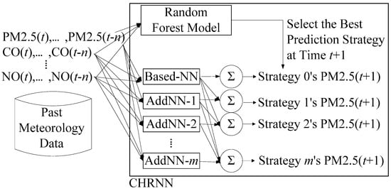 The PM2.5 prediction process designed in this study includes several parts. It is shown in Figure 6, including (1) using modified false nearest neighbor method (MFNNM) to identify suitable predictive features in the datasets and their time-delay terms; (2) using the usual case emphasizing normalization (UCENormalization) to normalize the PM2.5 time series values to help the based-NN learn the long-term changes in PM2.5 concentrations; (3) constructing the based-NN; (4) constructing several AddNNs based on the modeling results of the based-NN; and (5) constructing a random forest to recommend CHRNN usage strategies for different time points. The details of these five parts are as follows: