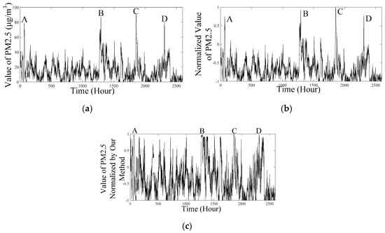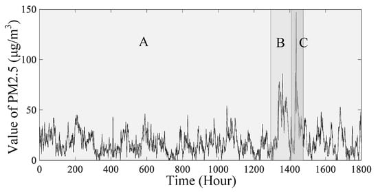 where u(•) is the PM2.5 time series value; Norm_u(•) is the normalized PM2.5 time series value; n represents the abnormal threshold value set by the user, and m is the upper bound of normalized values for normal conditions. Note that the value distribution ranges of normal conditions and sudden circumstances in the original data should be taken into consideration when m is set. If the value distribution range of sudden circumstances is small, then it is recommended that m be near 0.9 to increase the accuracy of model learning for normal data. If the value distribution range of sudden circumstances is large, however, then it is recommended that m be around 0.7 to prevent the values from being overly compressed, which would affect model learning of sudden values. In the end, the results of any PM2.5 time series normalized using Equations (3) and (4) should fall within the range of [−1, 1].