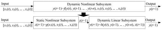 The Hammerstein recurrent neural network is currently one of the most effective shallow neural networks for time-series prediction [29,40]. Time-series prediction has always been regarded as a difficult problem due to the nonlinear dynamic characteristics of complex systems. Essentially, the time value of t + 1 is affected by the previous time values of t, t − 1, …, t − n (dynamic system), and there is a nonlinear relationship between the first few time values and the value of t + 1. Hammerstein subsystem models [41,42,43] are meant to overcome this problem. They comprise a static nonlinear subsystem with a dynamic linear system operating in series, as shown in Figure 3. This provides two benefits when modeling and predicting time series: (1) The dynamic behavior of the time series is processed by a dynamic linear module, whereas the nonlinear behavior is processed by a static nonlinear module. This greatly facilitates modeling and improves accuracy. (2) Numerous mathematical models, such as a nonlinear regression model or neural network, can be used to replace the static nonlinear subsystem and dynamic linear system, thereby making it possible to customize time-series prediction problems. The Hammerstein subsystem model has been widely used in a variety of fields. Westwick and Kearney [41] and Dempsey and Westwick [42] applied a Hammerstein subsystem model to model the dynamic stretch reflex system. Abd-Elrady and Gan [43] achieved good results by applying a Hammerstein subsystem model to signal processing. Mete et al. [44] employed a similar approach in system identification.