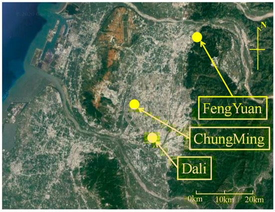 The meteorological data collected in this study comprised hourly data collected in 2018 by three air-quality monitoring stations run by the Environmental Protection Administration (DaLi, FengYuan, and ChungMing) in Taichung, Taiwan. The locations of the monitoring stations are shown in Figure 4. We considered these three stations because they are situated in areas where air pollution is the most severe and the population is the densest. From each station, we collected 12 types of data associated with air pollution, including levels of PM2.5, PM10, CO, O3, SO2, NO, and NO2, wind speed, hourly wind speed, relative humidity, temperature, and rainfall. Note that although general meteorological observatories provide air quality index (AQI) values, we opted not to consider AQI values in the current paper. AQI values are derived from particulate matter concentrations as well as carbon monoxide, sulfur dioxide, and nitrogen dioxide, and tropospheric ozone levels. From a mathematical perspective, AQI values are highly dependent on at least one of the above values. Thus, even if we input AQI in addition to the five above-mentioned values, the corresponding improvement in prediction accuracy would be negligible due to overlap. Furthermore, entering AQI values would greatly increase computational overhead by increasing the dimensionality of the data. Of course, it would be possible to formulate predictions based solely on AQI values; however, this would not adequately reflect the variations in the five pollution values. The exclusive use of AQI values for prediction would reduce the scope of the five pollution values, leading to a corresponding decrease in prediction accuracy.
