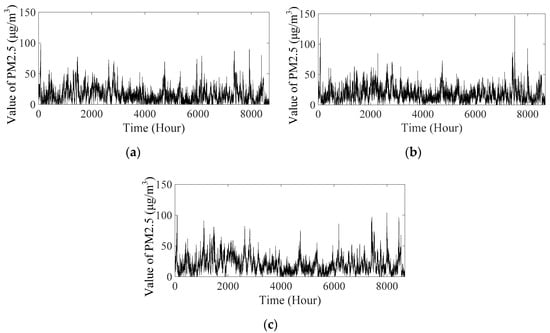 One whole year of particulate matter 2.5 (PM2.5) data from three target locations in 2018: (a) DaLi; (b) FengYuan; (c) ChungMing.