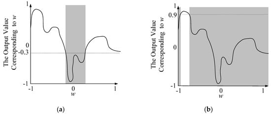 Graphs explain the operational range of weights in a neural network: (a) operational range resulting from general normalization; (b) operational range resulting from the usual case emphasizing normalization method (UCENormalization).