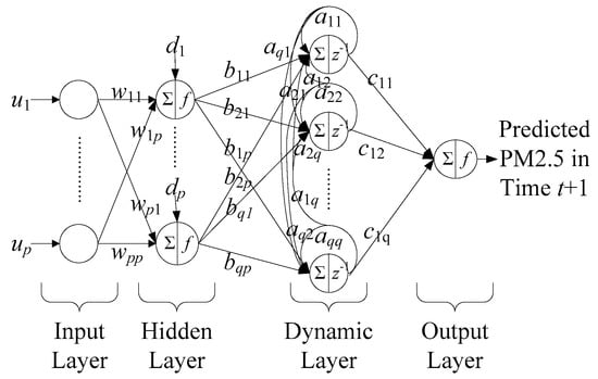 For the framework of the based-NN in the CHRNN, we adopted the HRNN [29,40], the effectiveness of which has already been demonstrated. As shown in Figure 9, it contains a total of four layers: the input layer, the hidden layer, the dynamic layer, and the output layer. The only function of neurons in the input layer is to pass on the input data to the hidden layer. Suppose n features are extracted using MFNNM, and the value of time-delay terms of each feature is m. Thus, the based-NN has (n + 1) × m inputs, where 1 represents a historical PM2.5 value. Next, the hidden layer is linked to establish the static nonlinear module. The neurons in this layer do not use any recursive items, which means they are static, and the nonlinear tangent sigmoid function serves as the nonlinear function. Then, the dynamic layer and the output layer are responsible for establishing the dynamic linear module. The recursive items of the dynamic layer are responsible for handling the dynamic part, while the linear function of the output layer is responsible for the linear part. The output of the based-NN is the normalized PM2.5 value of the next time point. The mathematical framework of the model is presented in Equations (5)–(7). Among those equations, Equation (5) is the formula from the input layer to the hidden layer, Equation (6) is the formula for the dynamic layer, and Equation (7) is the formula for the output layer. Furthermore, in the neurons in layer j, we use Ii(j)(k) and oi(j)(k) to represent the input and output of neuron i at time k.
