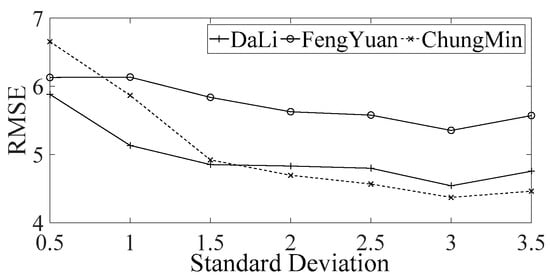 In this section, the UCENormalization parameters were determined via the experiment. These parameters include (1) the abnormal threshold value and (2) the upper bound of normalized PM2.5 values in normal conditions. Figure 12 displays the impact of various abnormal threshold values on RMSE at the three locations. The x-axis in the graph is the number of standard deviations. If the PM2.5 value exceeds the value of the mean plus the number of standard deviations. Then, it is considered an abnormal condition. The y-axis represented the corresponding values of RMSE of the x value. As can be seen, the RMSE at the three locations gradually decreased as the number of standard deviations increased but increased after three standard deviations. This is because setting a lower abnormal threshold value means that more data points in the PM2.5 time series will be categorized as abnormal conditions, thereby forcing the AddNNs to learn too many things and lowering their prediction performance, which in turn affects the performance of the CHRNN. When the threshold value is set for higher than three standard deviations, most of the data points in the PM2.5 time series are regarded as normal conditions rather than abnormal conditions. This lets the AddNNs to lose their purpose and the RMSE to increase. We thus set the abnormal threshold value as three standard deviations in the subsequent experiments. Figure 13 displays the impact of various upper bounds of normalized values for normal conditions on RMSE at the three locations. As can be seen, the RMSE at the three locations initially decreases as the upper bound increases but then increases with the upper bound once it reaches the lowest point. In the first part, it increases with the upper bound, thereby widening the operational range of every neural network in the CHRNN and bringing the prediction results closer to the actual PM2.5 time series. In the second part, the upper bound of the normal values is too high, which reduces the range of abnormal values. It also makes it difficult for the CHRNN to learn the abnormal values and decreases the prediction accuracy. It can be noted that the lowest points of the three locations appear at different upper bounds. The lowest points of the RMSE for DaLi and RMSE are at 0.9, while the lowest point for ChungMing was at 0.7. This may be associated with the PM2.5 value distributions at the three locations. There are a greater number of high PM2.5 values at ChungMing, which has a greater population density and more vehicle exhaust fumes (higher CO values) than the two other locations. These make the pollutant sources in the area more complex (see Table 2), so the abnormal values need a wider range for the CHRNN to learn and maintain higher prediction accuracy. In contrast, there are few abnormal values at DaLi and Feng-Yuan, so the abnormal values did not need a large range for the CHRNN to obtain good results. In the subsequent experiments, we used the optimal upper bounds for the normalized values at the three locations.