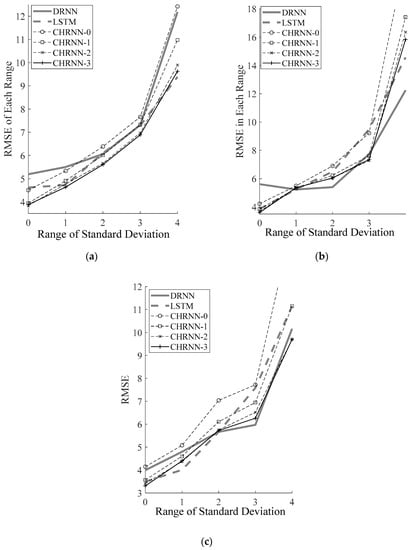 Next, Figure 14 presents the details on how the CHRNN performs better than the deep learning models. The x-axis is the ranges of different PM2.5 values, and the y-axis is the RMSE of all the PM2.5 values within said ranges. The solid and dashed gray curves represent the results of the DRNN and LSTM, while the solid black curve shows the results of CHRNN-3. The dashed black curves present the results of the other CHRNNs. A comparison of the results of DRNN, LSTM, and CHRNN-3 shows that the errors in the normal PM2.5 values of CHRNN-3 (i.e., three standard deviations) are smaller than those of DRNN and LSTM. The prediction errors for abnormal conditions are greater than those of DRNN and LSTM, but they are not far off. However, the normal PM2.5 values at the three locations accounted for over 80% of all the datasets, so the overall performance of CHRNN-3 is naturally better. Next, observing the performance of CHRNN-0 through CHRNN-3 regarding different ranges of PM2.5 values in Figure 14, it can be seen that with every AddNN added to the CHRNN, the prediction results in all PM2.5 ranges improve. Furthermore, improvements in greater PM2.5 values are even better. This also demonstrates that the CHRNN can use the AddNNs to effectively predict the changes in abnormal values in the PM2.5 time series.