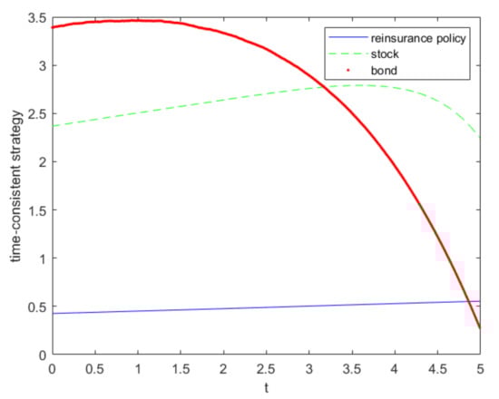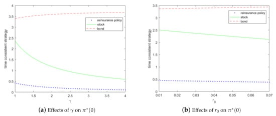 First, we discuss the effects of two basic parameters: and on the equilibrium reinsurance and investment strategy. By taking derivatives, we have , . This means that, as increases, equilibrium investment in stock and insurance risk exposure will decrease. It is natural because the insurer will buy more reinsurance and buy less stock when they become more risk averse. Figure 2 displays the effects of and on equilibrium strategy at time 0. We can find that bond investment will increase as increases, partly because they are a safer asset when compared with stock. Additionally, we have , , which is shown in Figure 2. In Figure 2, we can see that increases as increases. This means that, as increases, the insurer will prefer risk free asset and bond to stock.