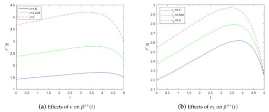 In this section, we present some numerical studies on the effects of model parameters on the time-consistent reinsurance-investment strategy. Throughout numerical analysis, the parameters of stochastic interest rate and stochastic volatility are referred to by Escobar et al. (2017) [], who calibrated the Heston-Vasicek model while using real market data. The parameters of insurance model are mainly referred to by Zeng and Li (2013) []. Unless otherwise stated, the basic parameters are given by , , , , , , , , , , , , , , , , , , , ,