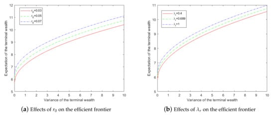 Figure 4 depicts the impact of initial interest rate and on the efficient frontier. We can see that the efficient frontier moves upwards as increases. Insurers tend to invest more in bond and less in stock when increases, and the insurance risk exposure will be smaller. In this case, the variance of the terminal variance will be smaller under the same expected terminal wealth. Efficient frontier also moves upwards as becomes larger. This is in accordance with our intuition, because larger means more return per unit risk.