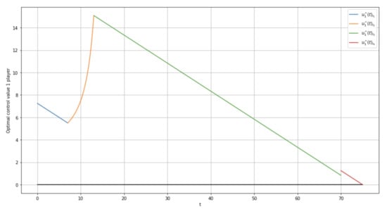 The optimal control of the first player is presented in Figure 2. This function is a piecewise function defined on four separate intervals. The optimal control’s values belong to the predefined set of admissible control values.