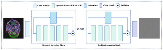 As Figure 2 shows, the proposed network is presented as an end-to-end convolutional neural network (CNN) [45]. Where the network utilized traditional convolutional operation for input and output as well as a novel dynamic residual attention block (DRAB) as the backbone of the main network. The input layer takes an normalized noisy image and generate a normalized residual noise [16] extracted from the input as . Here, and represents the height and width of the input as well as the output of the proposed DRAN.