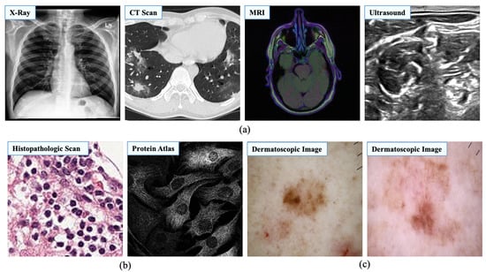 - Radiology: This category comprises the microscopic images collected from of four different modalities, including X-ray [52], MRI [53], CT scans [54], and ultrasound [55] images.