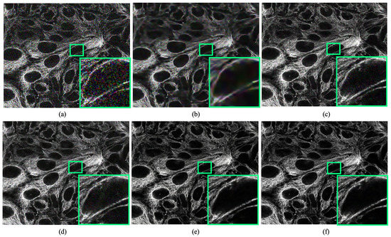 Qualitative comparison of microscopy image denoising at . The proposed method illustrates significant improvement over the existing denoising method by improving perceptual image quality. (a) Noisy input. (b) Result obtained by BM3D [11]. (c) Result obtained by DnCNN [16]. (d) Result obtained by Residual MID [12]. (e) Result obtained by DRAN (proposed). (f) Reference sharp image. Source by: (https://www.kaggle.com/c/human-protein-atlas-image-classification).