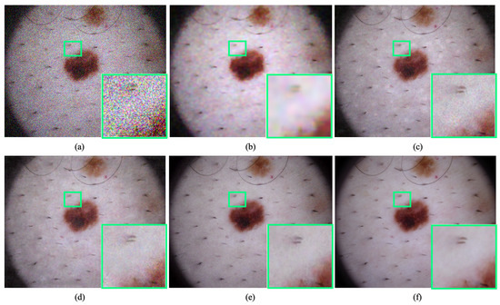 Qualitative comparison of dermatology image denoising at . The proposed method illustrates significant improvement over the existing denoising method by improving perceptual image quality. (a) Noisy input. (b) Result obtained by BM3D [11]. (c) Result obtained by DnCNN [16]. (d) Result obtained by Residual MID [12]. (e) Result obtained by DRAN (proposed). (f) Reference sharp image. Source by: (https://www.kaggle.com/kmader/skin-cancer-mnist-ham10000).