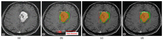 Computer-aided detection has obtained momentum in medical image analysis by observing the oversights of given images [65,66]. However, the presence of sensor noise in a given image can misguide the detection system, as shown in Figure 9. Here, the effect of image noise has studied over tumour detection and localization on brain MRIs using state-of-the-art Mask R-CNN [67]. It can be apparent that even the well-known learning-based method struggle in localizing the abnormalities on a noisy image. Contrarily, the addition of proposed DRAN drastically improve the localization performance of the respective detection method by performing denoising.