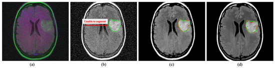 Segmentation on brain MRI image. The green and red outline indicate the ground truth and the segmented area. The proposed DRAN can drastically improve the segmentation performance by excluding the noise present in the target image. (a) Noisy image. (b) Noisy image + U-Net [68]. (c) Denoised image obtained with DRAN + U-Net [68]. (d) Reference clean image + U-Net [68]. Source by: (https://www.kaggle.com/mateuszbuda/lgg-mri-segmentation).