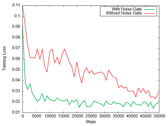 Impact of noise gate in network performance. It can be seen that the noise gate drastically improves the performance of the proposed method compared to its counterpart.