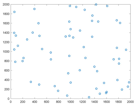 The results above demonstrate that both the PGA and the APGA mentioned in this paper can be used to find the best solution within a short time when resolving small and medium-sized theme park routing problems. Then, we expanded the test scale in the second test. We generated a theme park with one entrance and 60 attractions at random within a 2000 × 2000 test environment, as illustrated in Figure 5.