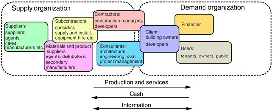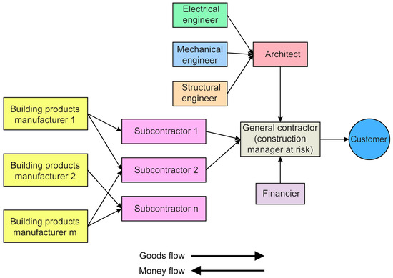 A construction supply chain comprises the entire process of construction businesses from the customer demands, conceptualization, design, and production to maintenance and repair, replacements, and after-sales services. Key elements of a construction supply chain are owners/customers, designers, main contractors, sub-contractors, and suppliers [7]. Because of diversity in dimensions, technologies, supplies, materials, and so on, in the construction industry, there is not a common concept that can be used to provide a certain definition for construction supply chains. However, in Figure 1 and Figure 2, two schematic diagrams are depicted which can show some important elements of a construction supply chain [8,9].