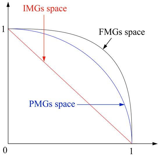 In Figure 4, we can see the difference between the spaces related to intuitionistic membership grades (IMGs), Pythagorean membership grades (PMGs), and Fermatean membership grades (FMGs).
