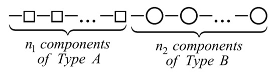 We next assume that the first n1 components of the m-consecutive-k-out-of-n: F system share a common reliability p1 (components of Type A, hereafter), while the remaining ones, namely the rest of the units, have a common reliability p2 (components of Type B, hereafter), where . The location of the component could be considered as a change point of the system, and consequently, the structure described above is called an m-consecutive-k-out-of-n: F system with a single change point. It is straightforward that in case of , the aforementioned structure reduces to the traditional m-consecutive-k-out-of-n: F system introduced by [3]. The proposed setup seems to be more flexible and realistic in comparison with the structure having the same failure criterion but consisting of identical components with common reliability. It is worth mentioning that structures with one or more change points have been already introduced in the literature (see, e.g., [25,29]).