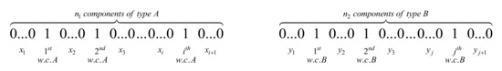 On the contrary, under the second scenario (Scenario 2, hereafter), the first component of type B that appeared in the structure line is considered to be in failure state. Consequently, a binary sequence of n elements (under Scenario 2), including i working components of type A (w.c.A) and j working components of type B (w.c.B), is displayed in Figure 3.