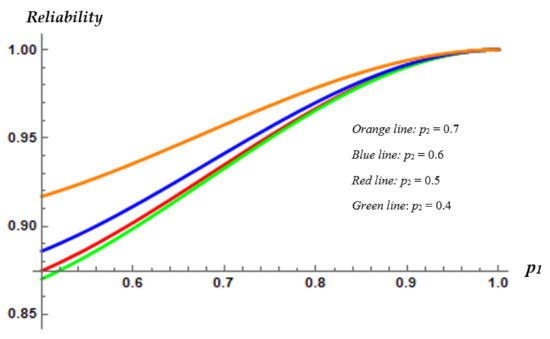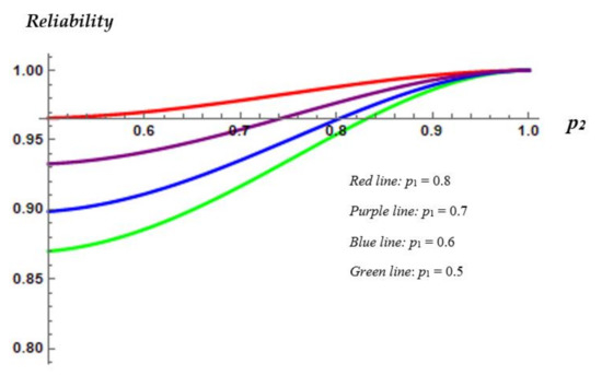 A similar argumentation could be developed for the behavior of the reliability of the proposed structure in terms of probability p1. Figure 5 illustrates the reliability values of the proposed structure under four different choices of parameter p1, namely p1 = 0.8 (Red line), p1 = 0.7 (Purple line), p1 = 0.6 (Blue line), and p1 = 0.5 (Green line).