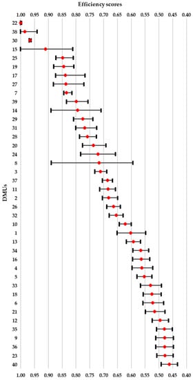 Figure 1 displays the range of efficiency estimates computed by FRM1. Thus, the highest value of each interval corresponds to , whereas the lowest value corresponds to . For each DMU, the red point corresponds to the FRM1 ranking index, i.e., . As it can be seen in the figure, the DMUs have been arranged in decreasing order of that index.