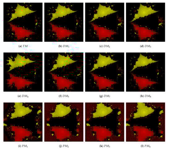 In this direction, we consider the nonlinear equation in interval or boundary with mesh points. Each mesh point is used as the initial value to analyze the convergence behavior for suggested methods , and and for comparison methods , and , respectively. The different colors (red, green, yellow, ...) are considered to represent the roots of . Choosing one mesh point, if schemes converge to any root of the equation, then it is represented as colors like red, green, and yellow under a tolerance of less than and a number of iterations less than 100. Otherwise, black color is assigned, which means that the mesh point does not converge to the required root. The following problems of multiple roots are studied.