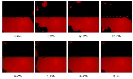 Here, we consider a non-polynomial whose roots are . The basins of Problem 2 are plotted with multiplicity and in Figure 3 and Figure 4, respectively. It is observed that suggested methods , and converge to the root shown as red color, and the less divergence region is presented as the black region, whereas method shows all divergence region in Figure 3. Similarly, methods , and do not converge at at least one point, so their graph is not shown here. Moreover, Figure 4 reveals that for multiplicity , the proposed methods have more convergence points than the earlier methods.
