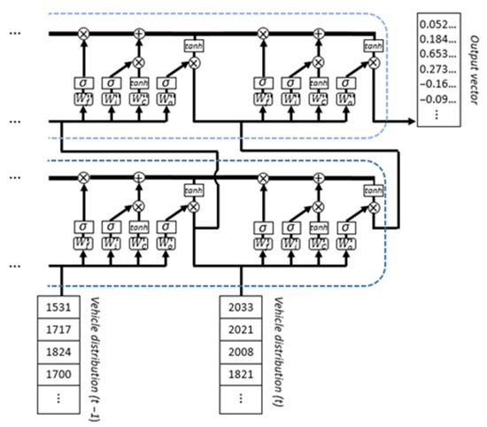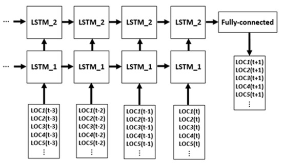 Examining the process from our perspective, the recurring input to the LSTM is represented, at each time step, by the current distributed vector representation along the multi-dimensional sequence of traffic volume, concatenated with the output vector of the LSTM module at the previous step. As a result of the network structure, the cell state contains the pattern information of all reference locations together, encoded in a single vector representation. Therefore, even if different locations initially targeted different entry channels, their single peculiarities are then mixed up in the LSTM state vector and, consequently, in the final output characterization. If the LSTM block contains multiple LSTM layers, the first layer is fed with the input data, the second layer is fed with the output of the first layer, and so on; the final output vector refers to the last step of the last layer. Figure 4 visually reports the last two steps of a sequence of vehicle flows, processed by a recurrent block of two LSTM layers.