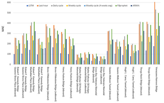 Referring only to a global mean score may not be fully revealing because of the diverse quantities of traffic volume in correspondence of different reference locations, which consequently leads to various distinctive degrees of prediction error. Figure 7, therefore, provides a complete overview of the MAE distribution over the multitude of reference points. Specifically, the distributed outcome of the LSTM model is compared to the baselines with respect to each of the 19 traffic flows under study, revealing a superior performance in all of them, regardless of any difference in the local traffic amounts. The best baseline is confirmed to be the same for the great majority of reference directions, whereas the sequential statistical processes are not able to catch the rapid variations in the series, ending up in a widespread poor fitting performance (combined with the inefficiency of requiring a separate fit for each single flow, not handling any multi-output option).