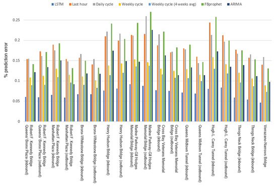 Figure 8 enriches the information, after normalizing by the actual local number of recorded vehicles, presenting the results in terms of percentage of predicted volume error, with respect to the real volume. The LSTM outcomes are reported to range between 4% and 9% of prediction error.