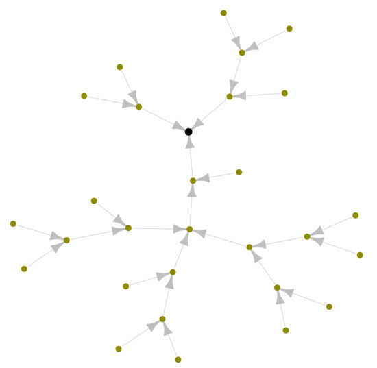 Oriented graph of a simple network model of the human lymphatic system suggested by Reddy et al. [3] with 29 nodes and 28 edges. The black node with out-degree corresponds to jugular vein (sink).