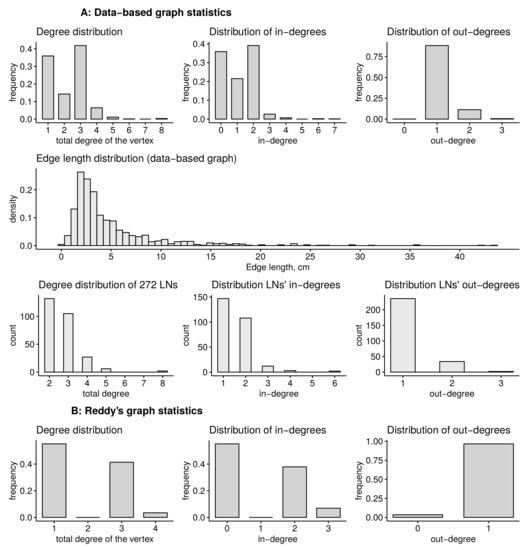 Statistical distributions of the anatomy data-based HLS graphs. (A) Statistics of the data-based graph, (B) of the Reddy’s graph. Statistics include the distributions of total degrees of the vertices, distributions of in- and out-degrees, as well as the edge-length distribution and degree distribution of the vertices that represent the lymph nodes (LNs) for data-based graph.