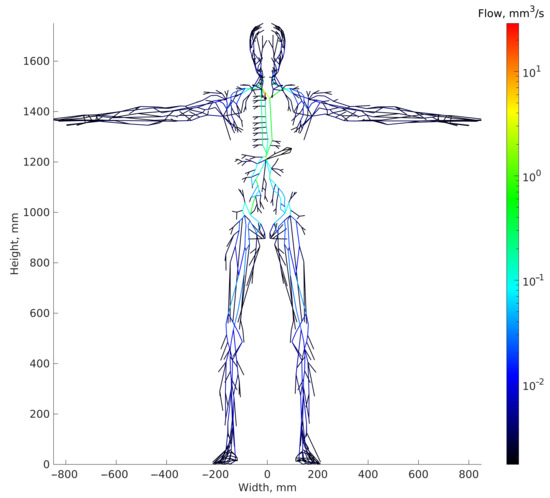 The value of the dynamic viscosity of lymph at a temperature of (Pa·s) is used. The pressure in the central venous duct ranges from 8 to 15 mmHg [2,14,15,16], and the value of mmHg is considered in the calculations. According to existing data, from 2 to 3 L of lymph per day gets into the central venous duct [17,18], hence we take this parameter to be 2.5 L per day. The resulting stationary lymph flow distribution in the HLS is shown in Figure 4.
